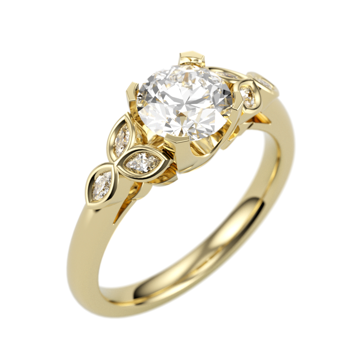 This is a beautiful ring that fits a 6.5 mm round center stone. Accented with 0.14 total carat weight GH-SI1 diamond melee, this ring has 4.3 grams of 14K gold. We can make this ring in any size.