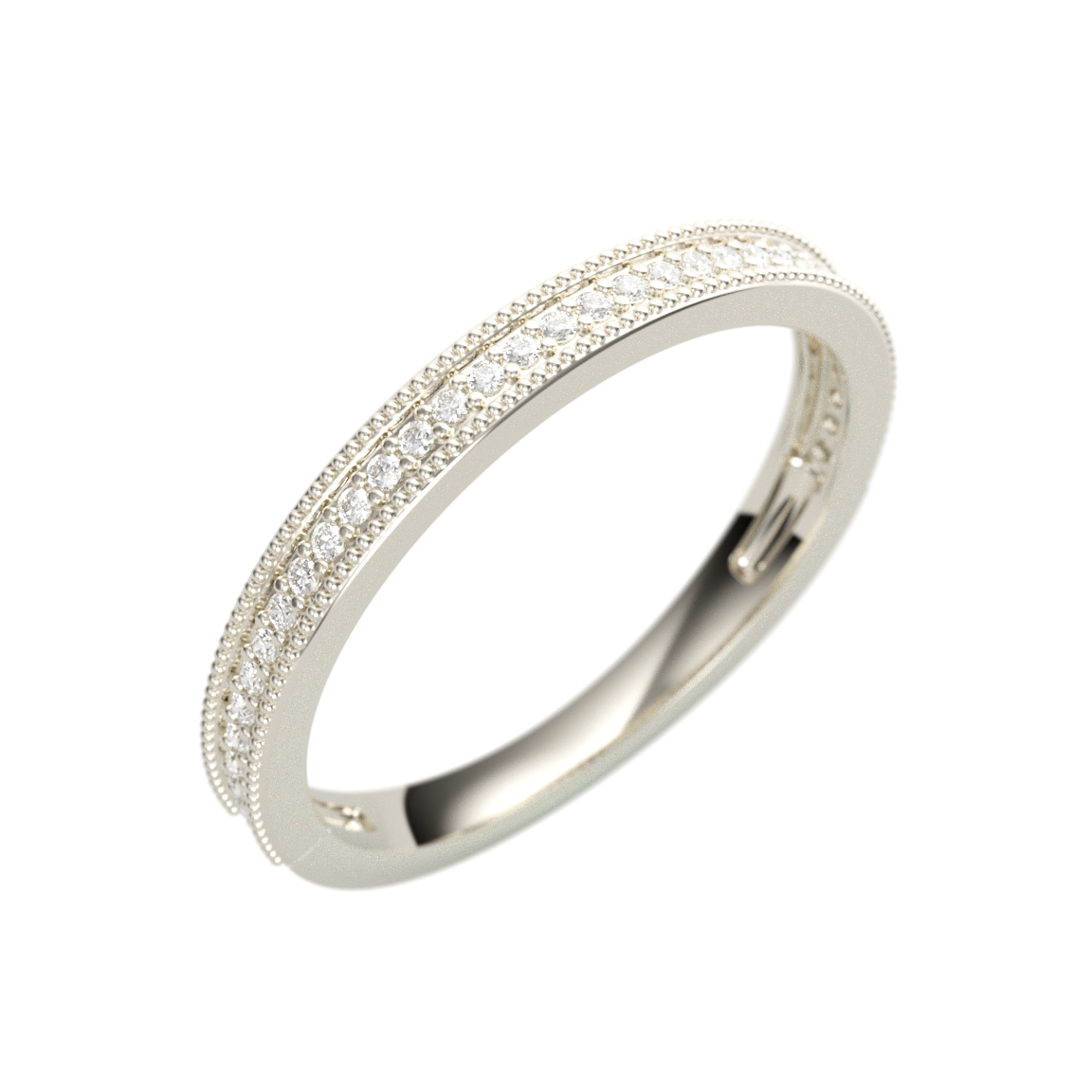 This decorative stackable band has 1.9 grams of 14K gold and 0.1 total carat weight of melee. We can provide this ring in any size.