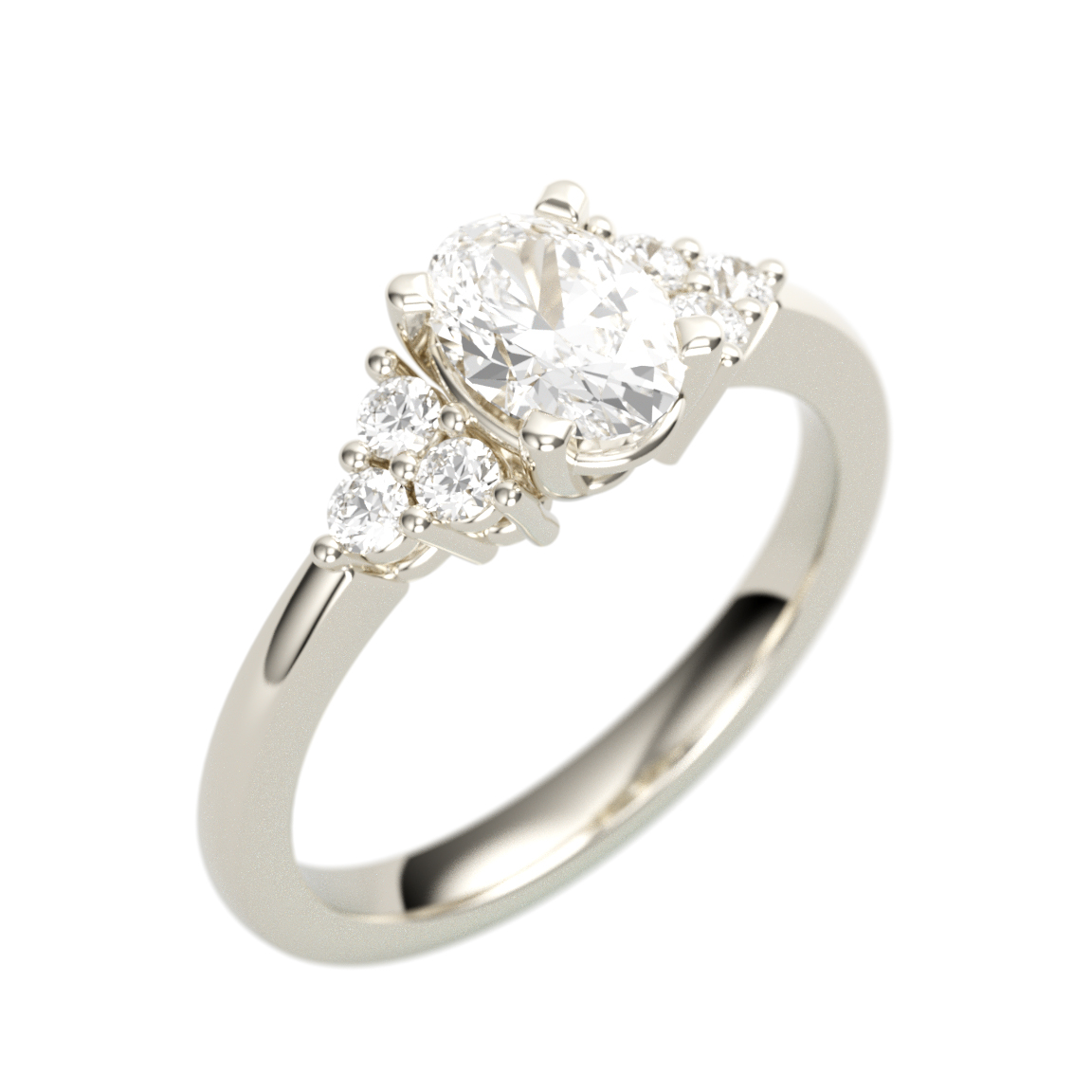 This ring has two bunches of diamonds on either side of a 7x5 millimeter oval center stone. It has 3.6 grams of 14K gold and 0.18 total carat weight of GH-SI1 diamonds melee. We can make this ring in any size.