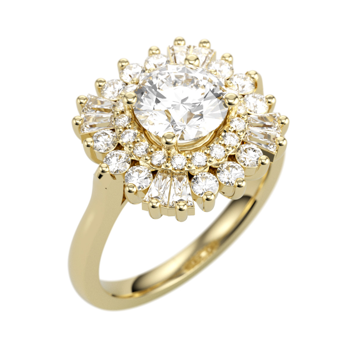 This is a square version of the starburst halo; this design allows it to refract more light letting it sparkle at every angle. It has 6.4 grams of 14K gold, 0.32 total carat weight of GH-SI1 diamond melee and fits a 5 millimeter round center stone. We can