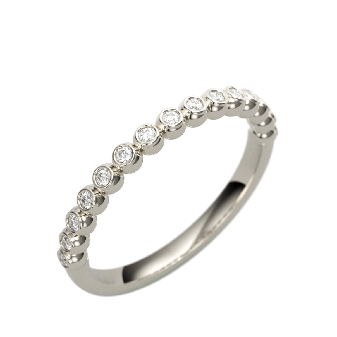 This stackable bezel set band has 2.3 grams of 14K gold and 0.15 total carat weight of melee. We can provide this ring in any size.