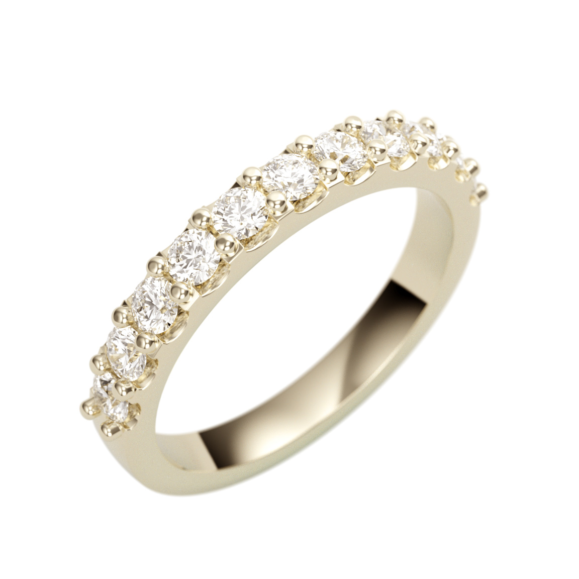This wedding band features 0.73 total carat weight of melee and 3.9 grams of 14k gold. We can provide this ring in any size.